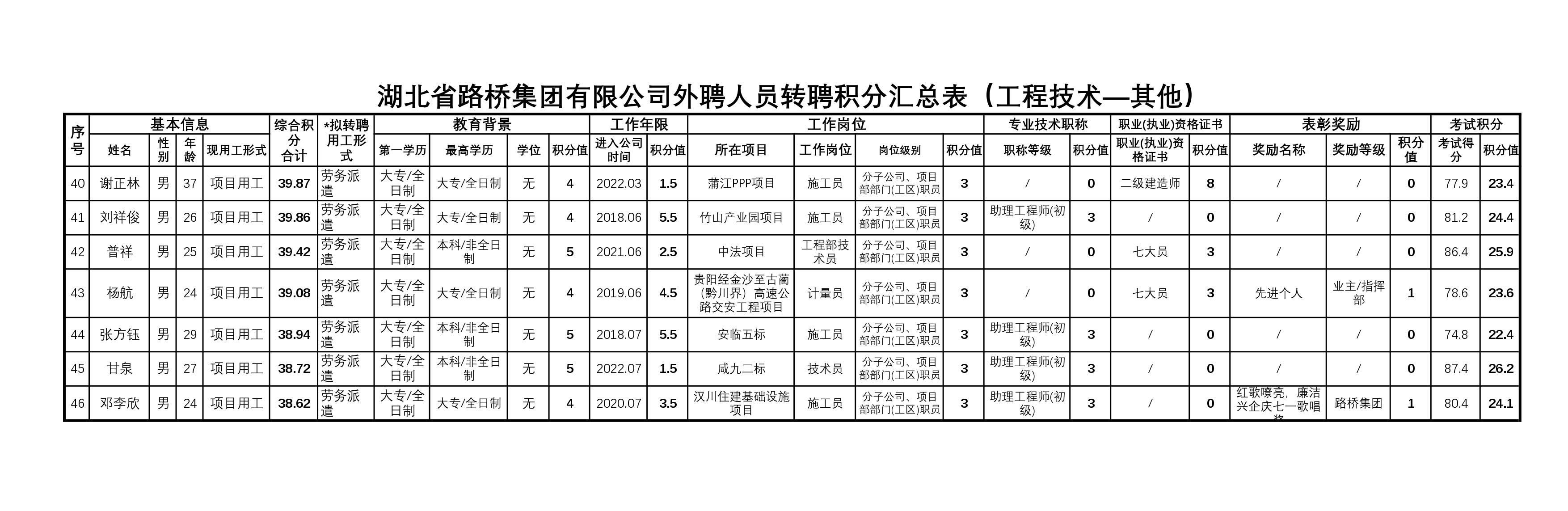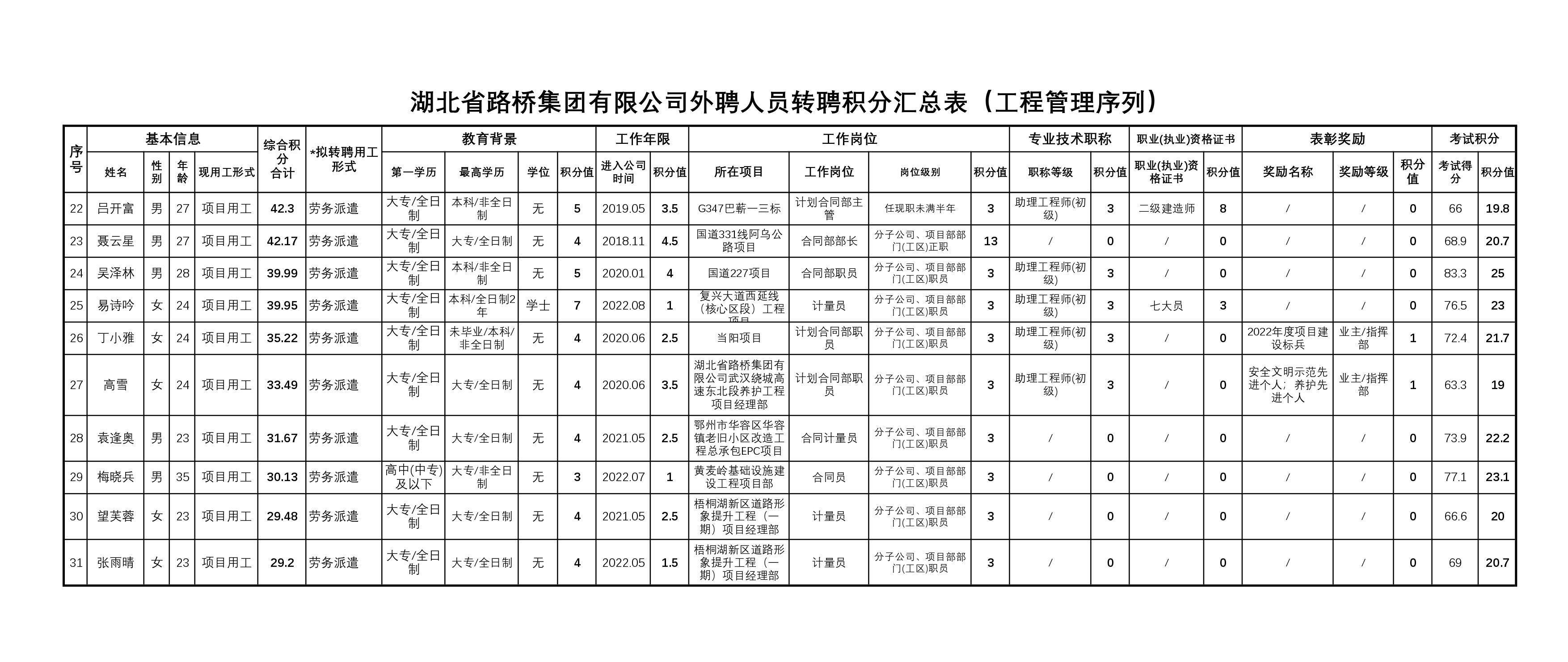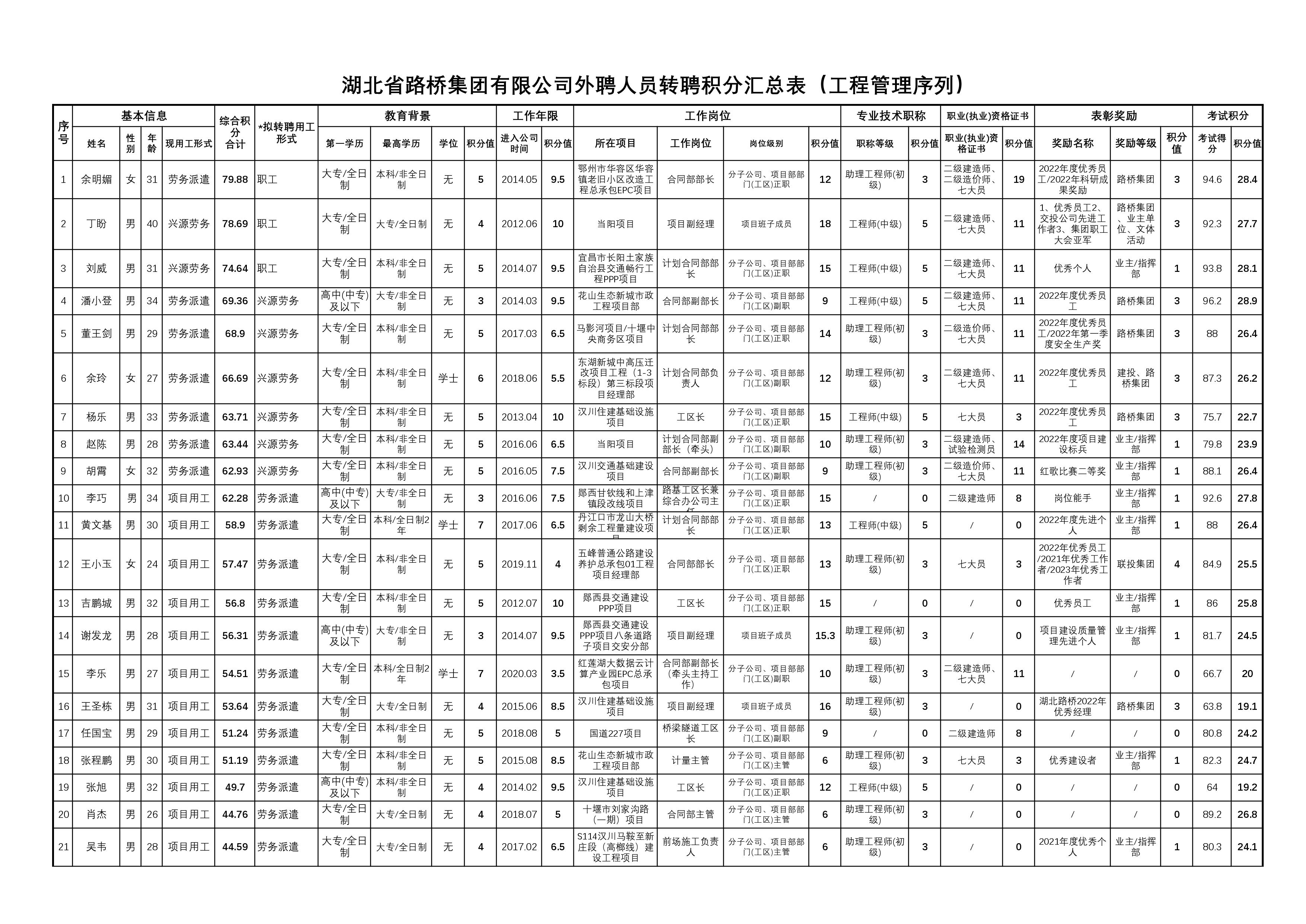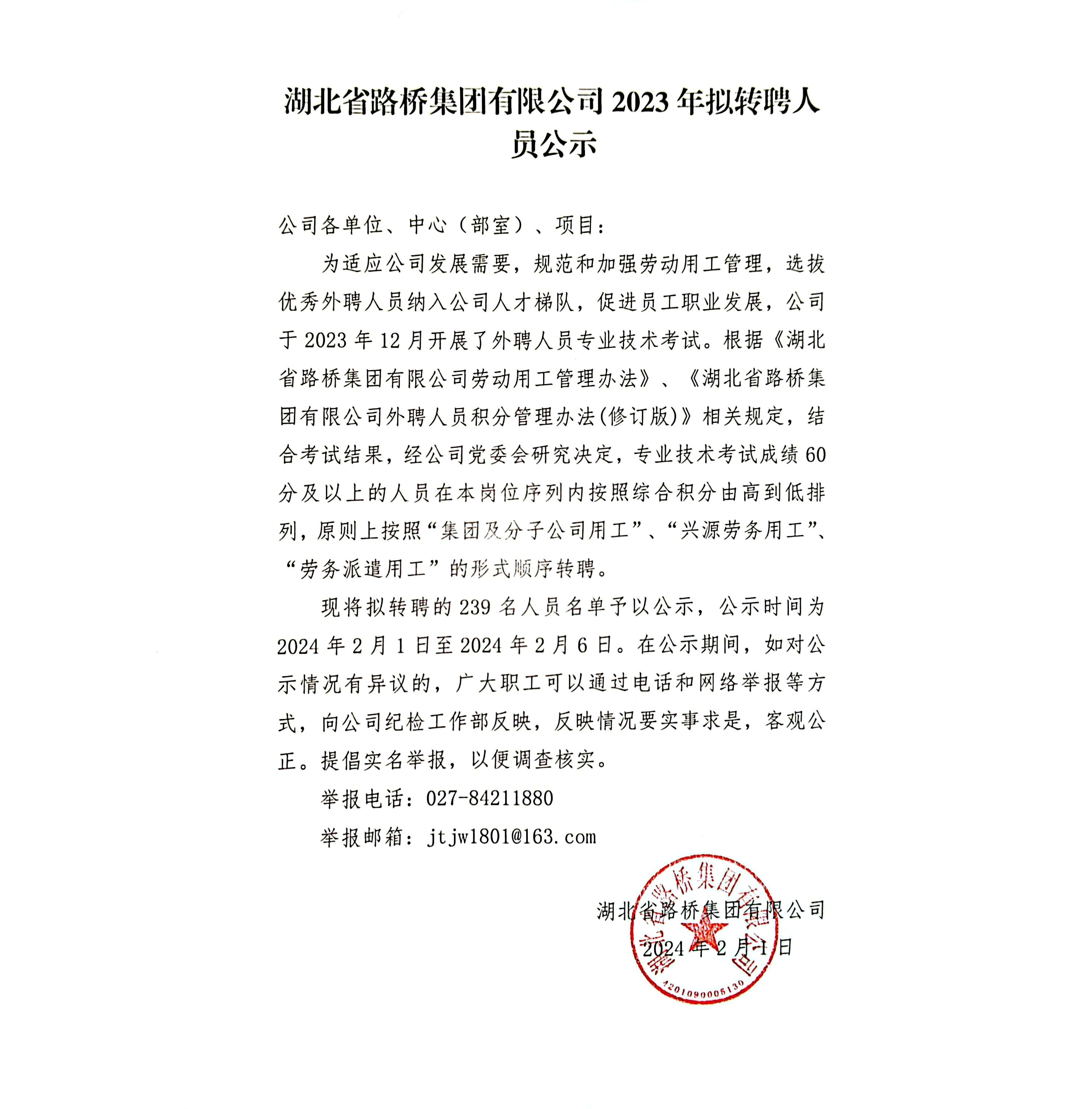 湖北省路橋集團有限公司2023年擬轉聘人員公示
