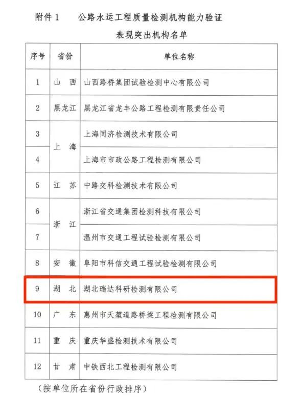 1月9日,中國交通建設監理協會發布表彰通知,瑞達科研檢測公司成功蟬聯第二屆公路水運工程質量檢測能力驗證“表現突出機構” 榮譽,是全省唯一一家連續兩屆獲此榮譽的檢測機構。