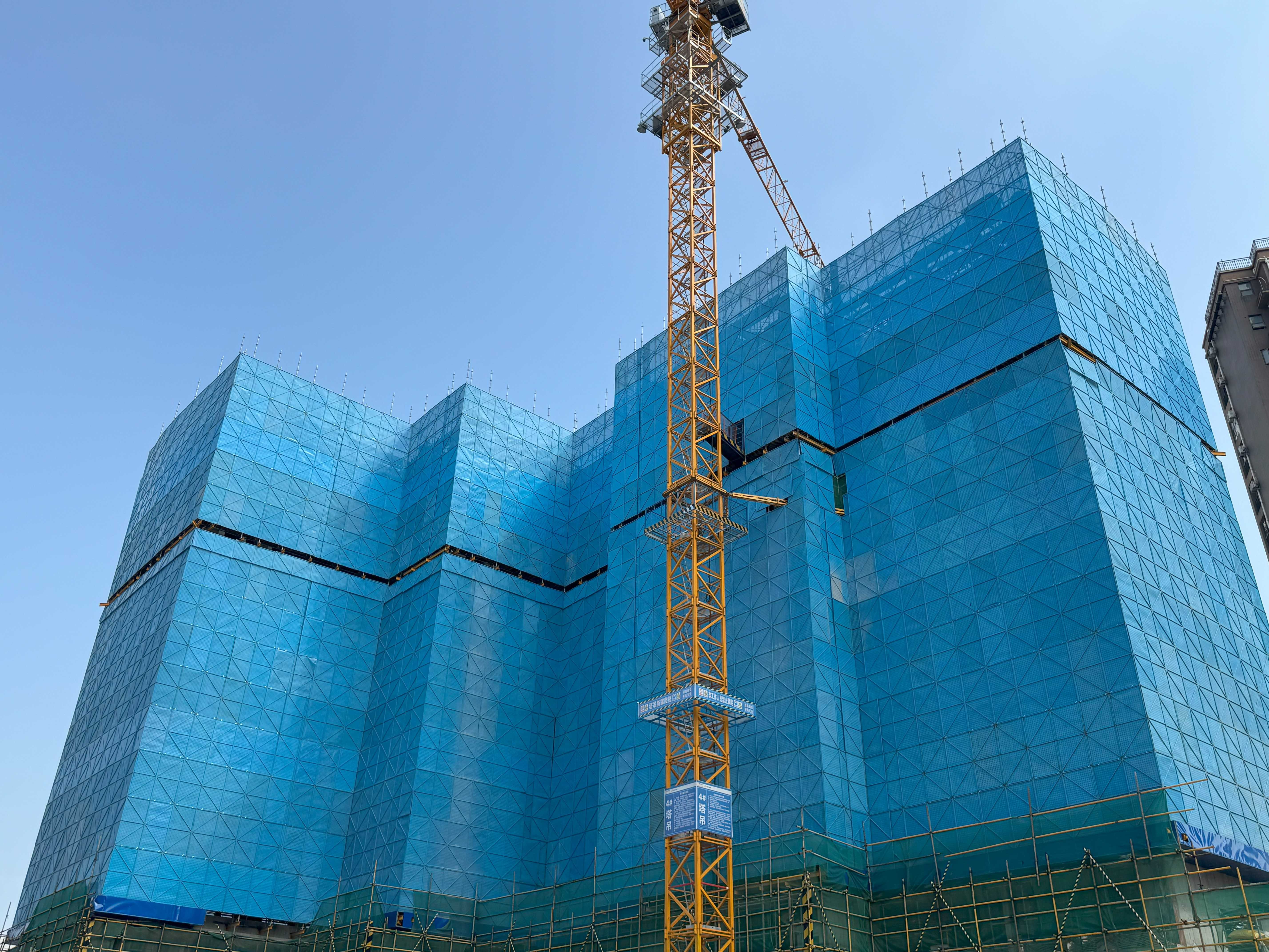 走進施工現場,極目新聞記者看到,在建的5棟高層建筑外立面上采用藍色的花籃懸挑腳手架,既美觀又安全。?